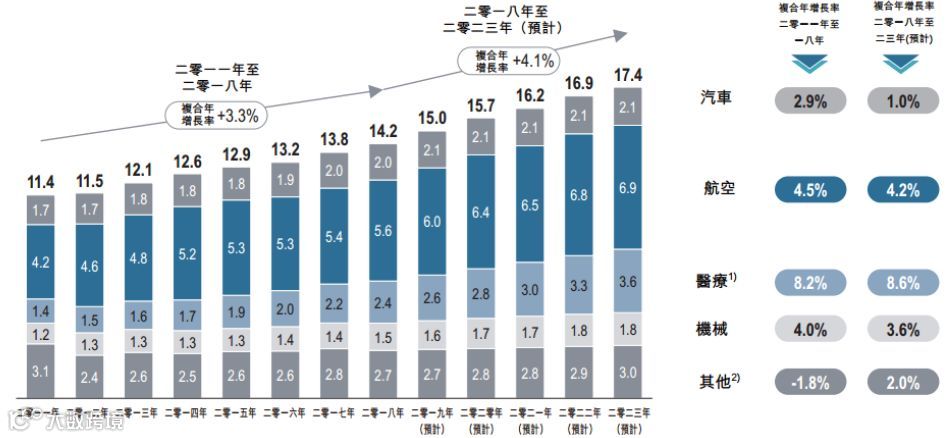 全球熔模铸造市场规模将由2018年的142亿美元增至2023年的174亿美元,复合年增长率4.1%,其中医疗增速最快,而航空领域收入占比最高。