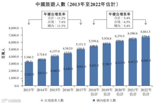 随著国内旅游需求的不断增长,到2022年前,国内旅游人数预计将达到66.83亿人,2018年至2022年间的年复合增长率为5.4%。