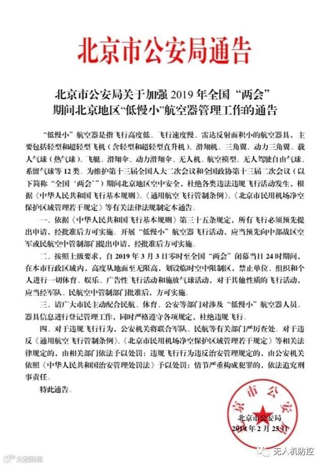 今天(26日)上午,北京市公安局发布《北京市公安局关于加强2019年全国“两会”期间北京地区“低慢小”航空器管理工作的通告》,3月3日零时至全国“两会”闭幕前,在本市行政区域内,“低慢小”航空器禁飞,禁止单位、组织和个人进行一切体育、娱乐、广告性飞行活动和施放气球活动。
