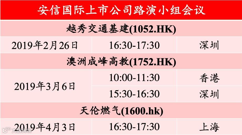 导读:安信国际将举办香港上市公司路演,借此诚邀您拨冗参加!