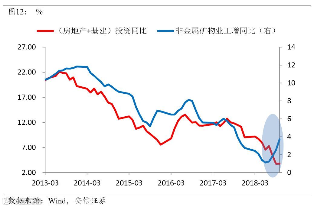 但随后我们看到,钢铁价格和生产都在明显走强,这意味着需求是较强的;而另一方面基建投资在明显走弱,这可能意味着房地产投资可能要好于预期。一个可能的解释是,房地产企业2018年资金紧张,但又想加大土地购置,因此房企拿地后,赶紧开工至总投资额的25%之后马上办理预售证后开盘销售,尽快回款,但之后缓慢施工。一般来说,房屋总投资25%的进程都已经建至地面以上,打基础的部分大概要消耗钢筋水泥的一半左右,这使得水泥包括钢铁的消耗量大增。