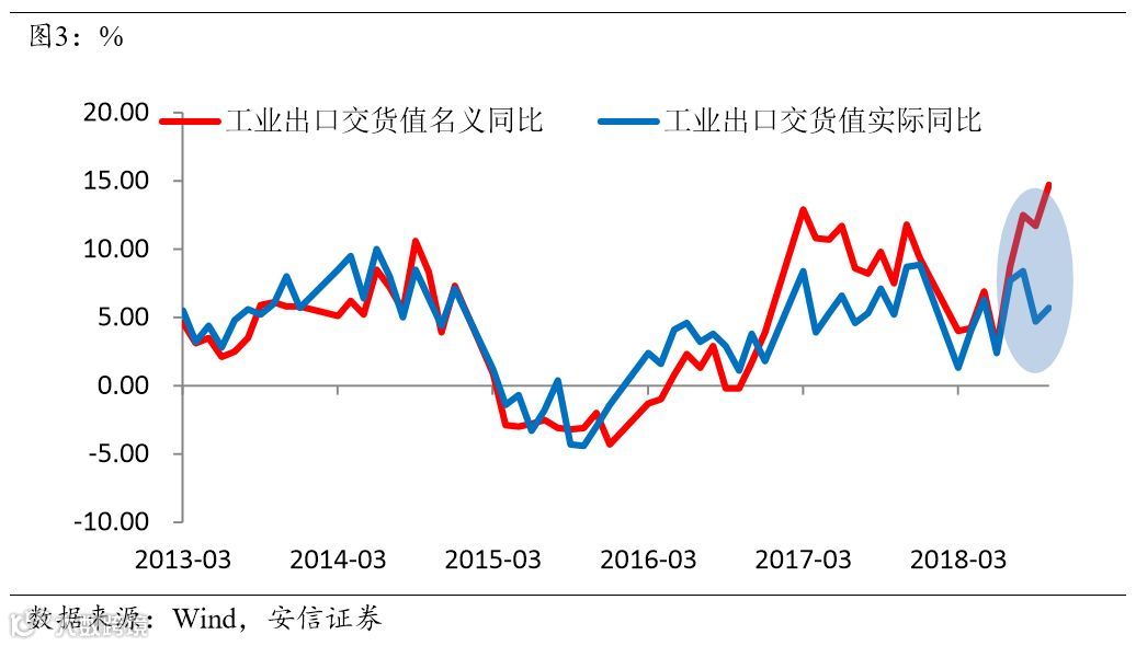 这与市场的感官认知有一定的差异,也与之前一路下降的走势不一致。我们认为,7-10月出口出现了明显的反弹,支撑了7-10月的工业生产。由于人民币贬值,出口名义值反弹明显;但即使从实际值看,7-10月的工业出口实际增速为6.6%,比3-6月的3.5%多增了3%;如果按照出口占工业生产的30%粗略估计,这四个月出口的回升拉升了工业增加值增速将近一个百分点。