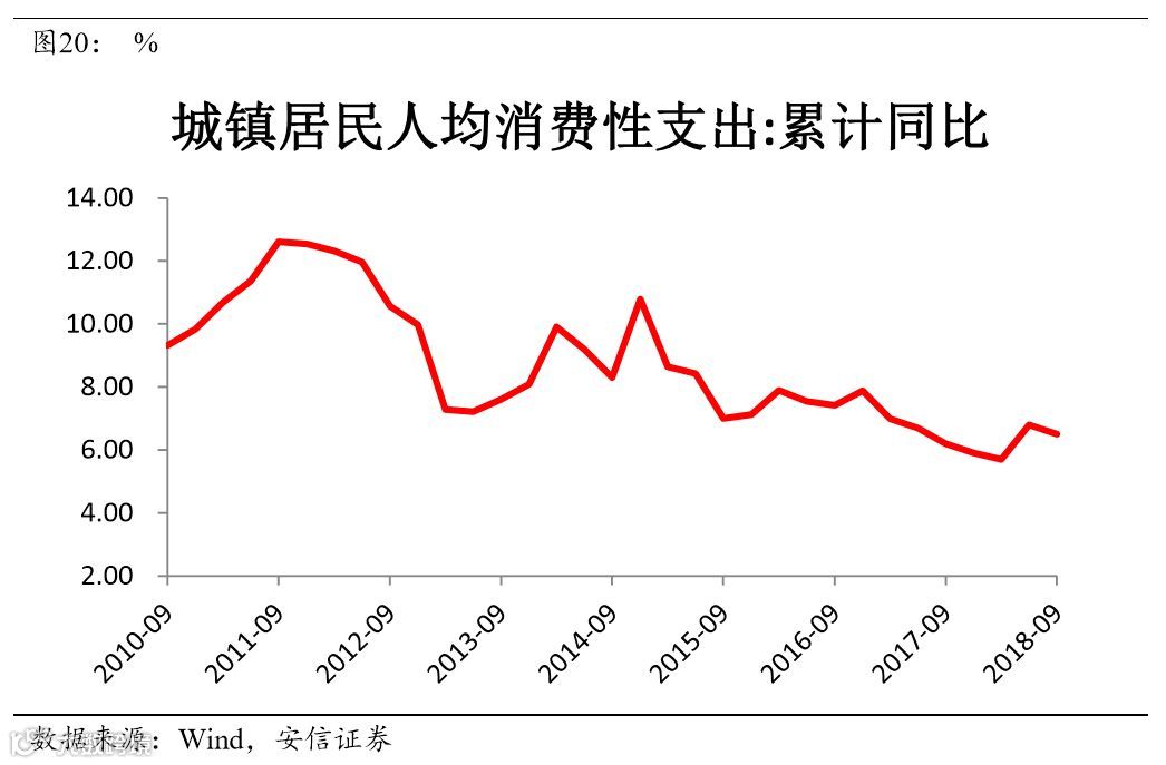 今年以来社会消费品零售总额和限额以上零售同比下滑明显,很大程度上是受到汽车销售大幅下滑的影响。如果剔除汽车部分,限额以上零售的其他部分同比增速甚至略有上行。但10月汽车销售跌幅收窄,同时限额以上零售增速明显放缓,使得去除汽车的其他消费出现了下滑。但这个下滑是否持续还需要进一步观察。另外,从城镇居民人均消费支出这个指标上看,暂时没有明显看到消费有大幅下滑的迹象。