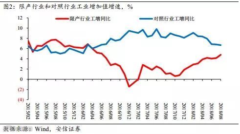 与此同时,PPI环比增速明显回升,石油、黑色、有色相关行业涨幅居前。观察限产组和非限产组增加值在7、8月份的表现,限产组同比增速持续回升,而非限产组回落。