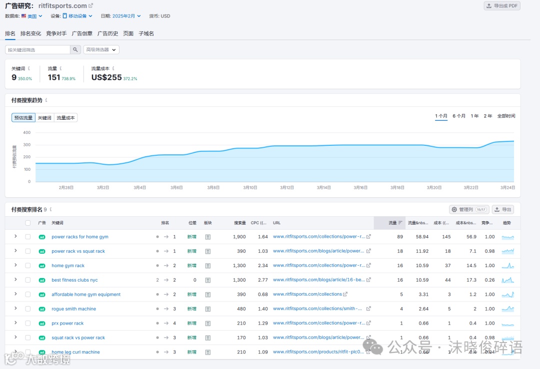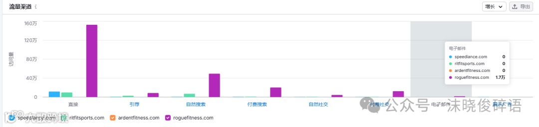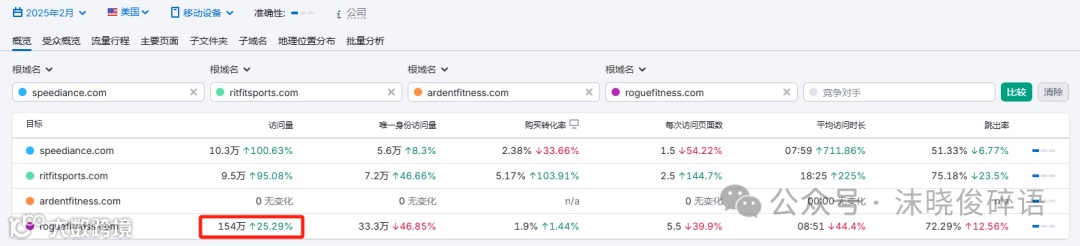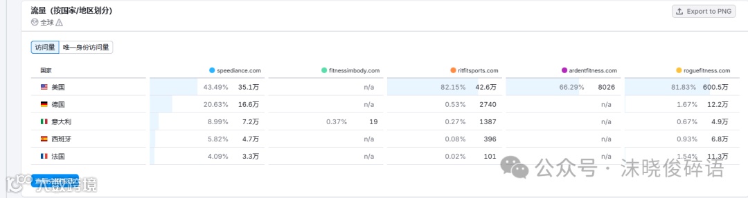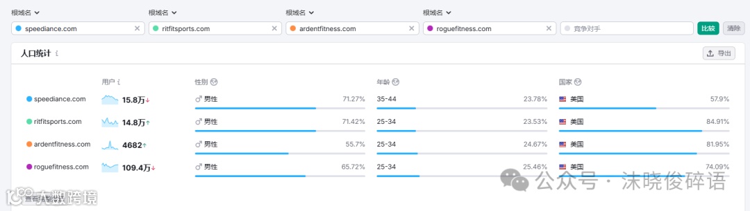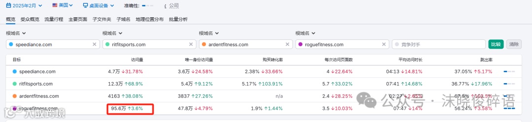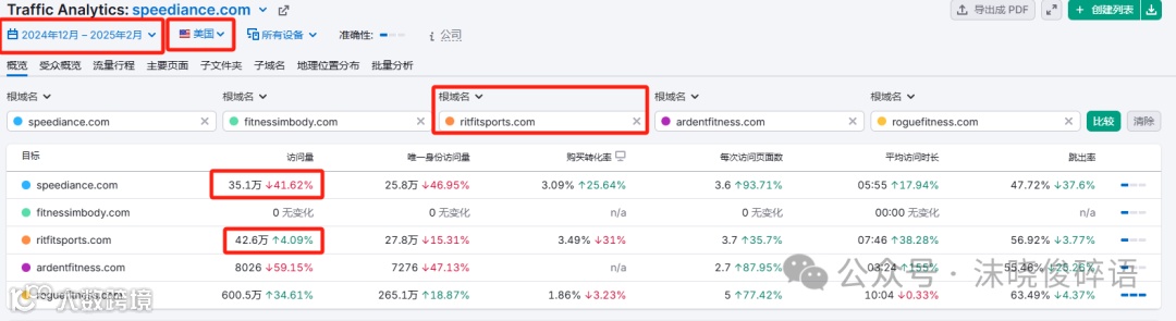 于是我们找到了fitnessimbody,ritfit,ardent fitness以及Rogue Fitness这几个品牌。我们看一下这几个品牌的流量。从数据中可以看到ritfitsports在美国和speediance差不多,略高一些。所以我们的目标首先应该是超越他,因为fitnessimbody没数据,所我就后面会去掉。