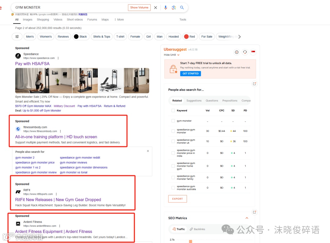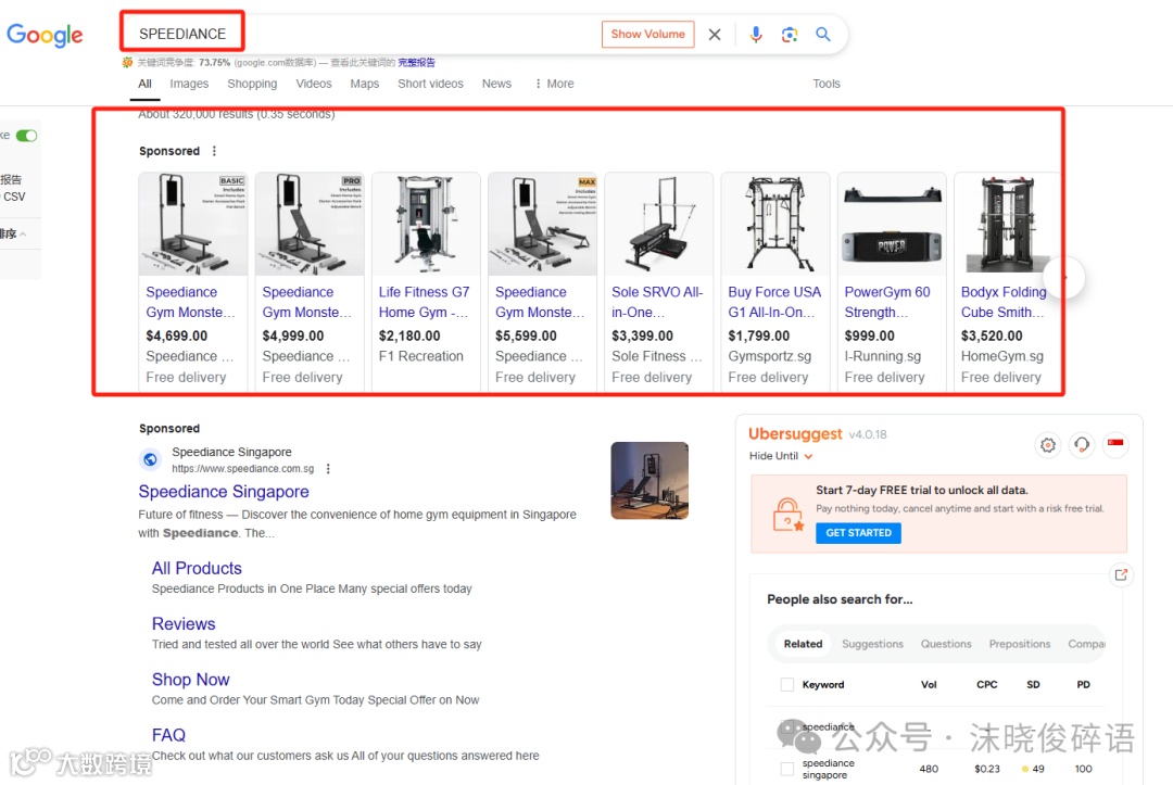 OK,了解完上述信息以后,我们来到Google浏览器搜索SPEEDIANCE,会发现该品牌相关的信息,看着是健身设备,史密斯架等,客单价至少都在1000美金以上,正在打Google shopping和搜索广告,估计PMAX也有,一会我们后面会分析和看。这里结合上篇我们分享的文章来说,这个客单价基本很难在tiktok以及Facebook这种平台上成交,大部分流量一定是在Google以及Youtube上面。这又回到广告平台渠道特性上去,不信我们一会后面看SPEEDIANCE和其竞品流量分布就知道了。