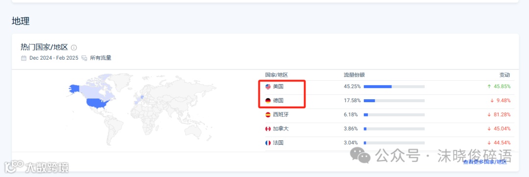 看完了网站基本信息,我们来看下其简单的流量分布情况,主要流量来自美国和德国。