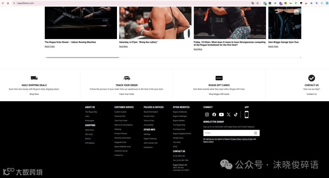 版面设计建议参考ROGUE,因为确实Speediance的首页没有展示运费相关的信息,要知道这种大件产品以及高客单价产品,运费以及时效往往也会用户是否下单起决定性作用。