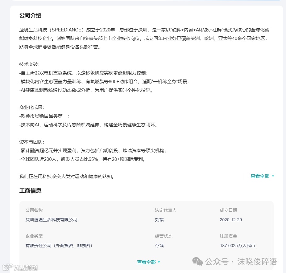 我们点击工商信息里经营状态存续下面的查看全部,然后看到公司的产品是力量训练设备,品牌名叫SPEEDIANCE,产品名是GYM MONSTER。