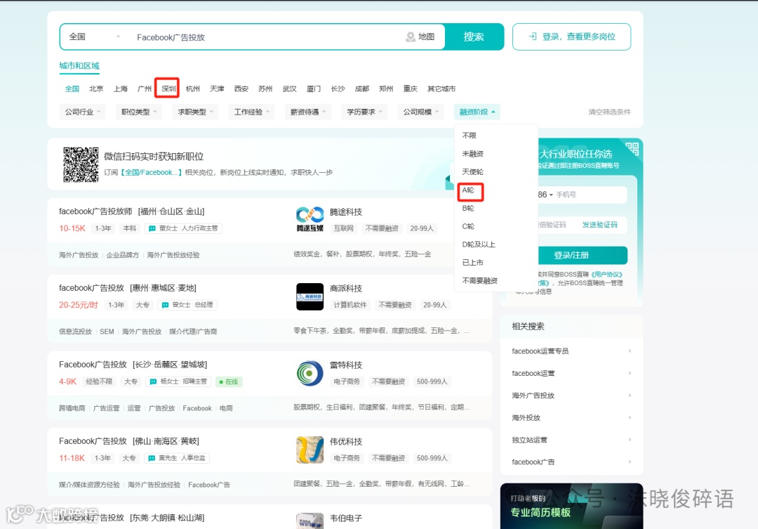 然后进入后做个初步筛选,这里我选深圳,融资阶段我选A轮(毕竟融了2轮了,代表有一些实力)。