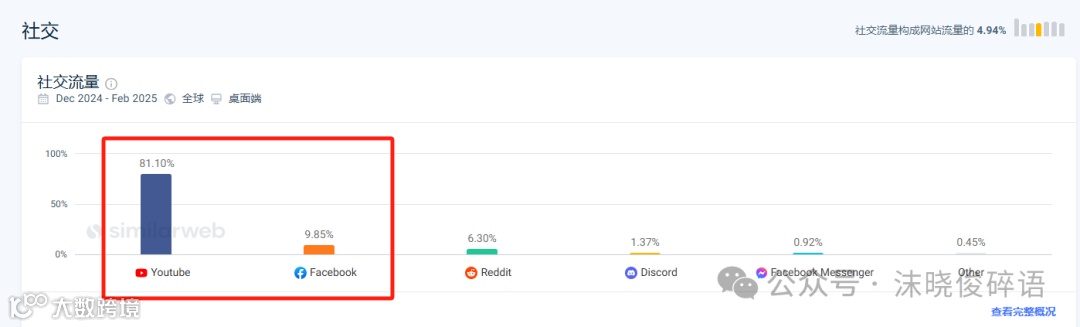 我们来看看社交流量具体来自哪个社交平台,大家看到没?是不是主要来自Youtube?