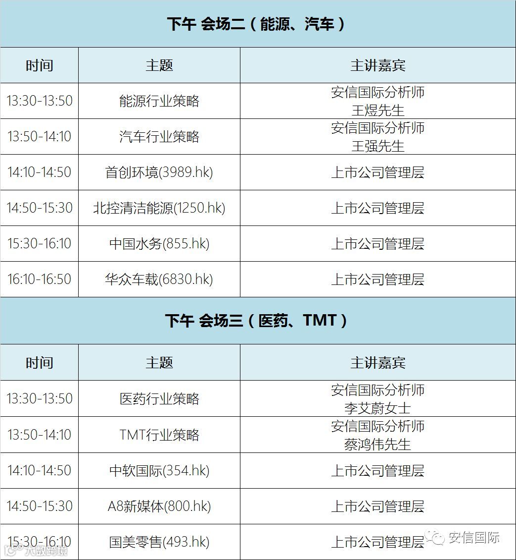 我们将竭力打造和客户深度互动的精品策略会,届时,安信国际首席策略分析师韩致立先生将点评港股新格局的投资策略,各行业分析师也将阐述他们具有前瞻性和影响力的观点。同时,我们特别邀请了港交所的专家解读互联互通的最新进展,香港上市机制改革可能带来的投资新机遇,以及在市场波动下港交所金融衍生品背后的投资价值。我们也将邀请一些极具投价值的香港上市公司与投资者进行交流。策略会兹定于2018年3月15日在北京金融街威斯汀酒店举办,借此诚邀您拨冗参加!