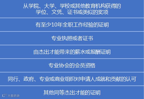 在科学、艺术或商业领域有优秀才能7项要求满足任意三项要求: