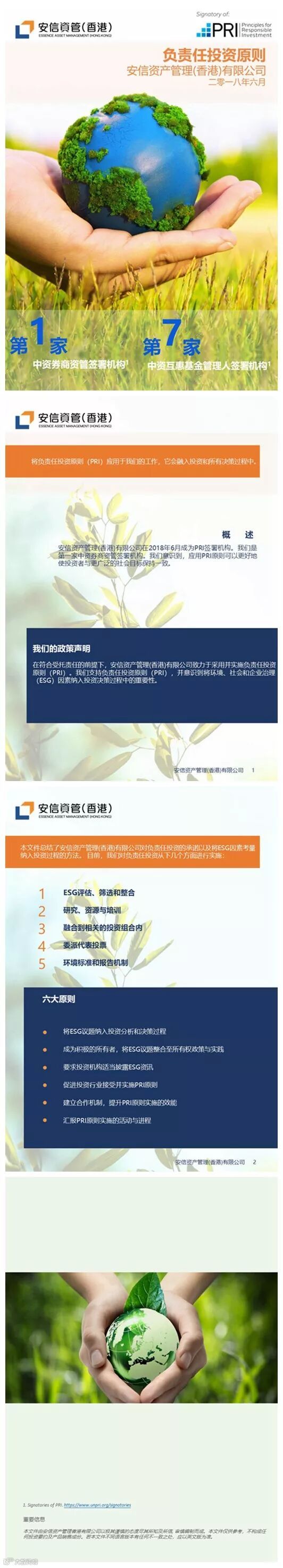 日前,安信资管(香港)宣布正式加入联合国支持的负责任投资原则(简称“UNPRI”),成为首批签署该原则践行ESG投资理念的中国资产管理公司之一。UNPRI旨在帮助投资者理解环境(Environment)、社会(Society)和公司治理(Governance)等要素(简称“ESG”)对投资价值的影响,并支持各签署机构将这些要素融入投资战略、决策及积极所有权中。