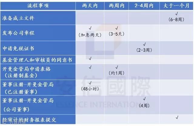 开曼基金设立主要文件提交以及董事注册所需时间如下所示: