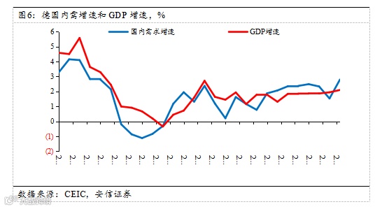 在本轮全球经济恢复中,发达经济体的增长更多是由国内需求所驱动的。例如,美国、德国等国的内需增长速度超过了GDP增速。