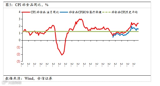 10月CPI同比1.9%,环比0.1%。分项看,食品CPI环比零增长,水平高于历史均值。分项中,鲜菜、鲜果价格环比明显超过历史均值。考虑到蔬菜价格可能在明年重回大年,自下而上来看推升CPI的可能性仍然较大。非食品环比0.1%,低于历史均值,一次性价格调整影响消退,医疗保健分项环比涨幅大幅回落。过去一段时间,非食品CPI处在较高水平,但剔除了其中的医疗保健项目CPI后,非食品CPI仅比历史平均水平稍高,显示在宏观经济稳定的背景下,整体通胀压力仍然温和。