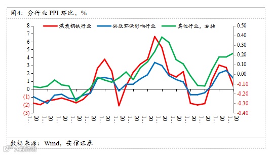 为了更好地观察供给侧改革和环保政策对工业品价格的影响,我们把PPI环比增速按照行业分成三组。一组是受到供给侧改革影响的行业,包括煤炭开采、黑色矿开采、有色矿开采、非金属矿开采、造纸、石化炼焦、化工、化纤、黑色冶炼、有色冶炼、非金属矿物制品等11个行业,另一组为不受政策影响的其他行业(剔除石油开采业PPI,从而剔除了原油价格波动的影响)。