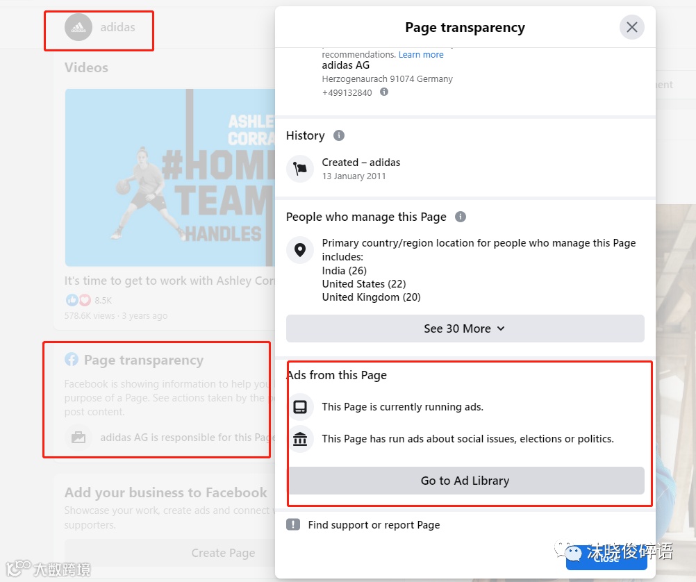1.免费:Facebook页面的page transparency,这里可以看到目前这个主页是否有在投广告,点击Go to Library即可看到。