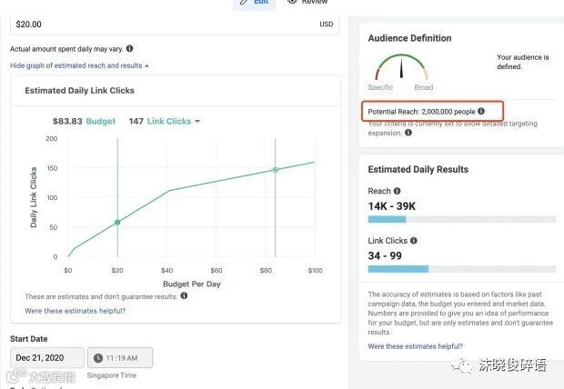对于不同的人群以及不同的产品和不同的目标,都会产生不同的结果。在投放之前可以在Facebook上看一下你对应的人群基数和大概花费以及预计效果,也可以提前做好ROI的预估