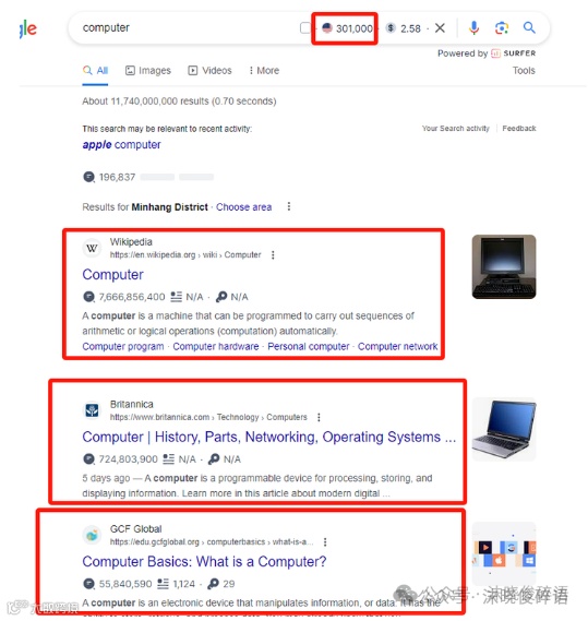 这个词是不是很明显,前五的结果中前四个全是购物平台。那这么展现的话,很明显搜索这个词的用户意图就是奔着购买电脑去的。