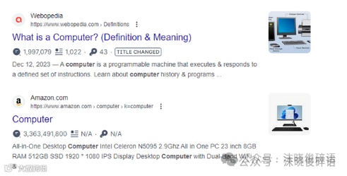 我们从图中可以看到,这个词在美国的月搜索量为301000,而其中结果页的前三个都是和文章相关的,也就是学习类的内容,而第四和第五则是学习类和亚马逊平台。
