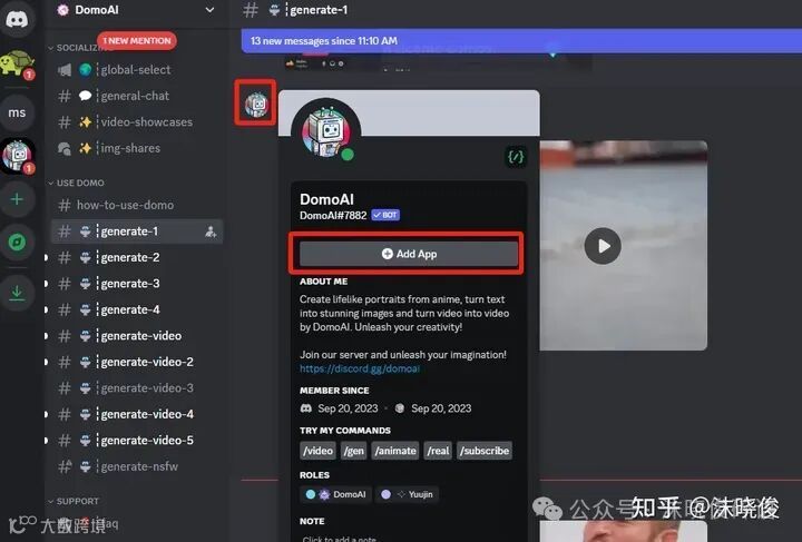 首先,我们点击Generate区域有其他小伙伴生成出来的图片或视频位置的地方的左侧点击下图中的机器人的头像,就是我红色小正方形圈出来的地方,点击完成后会弹出小方框右边的长方形条,我们点击Add App。
