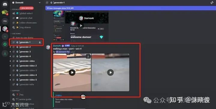我们拖动左边鼠标往下滚动会看到一个generate频道,我们点击这个generate后就会发现右边就是其他小伙伴们生成出来的视频或者图片了,这个跟Midjourney生成出图的位置区域是一样的。