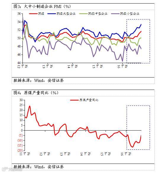 事实上,制造业PMI与工业增速的背离已经持续了一段时间。这可能与环保趋严和行业集中度提高背景下,中小企业经营困难,订单较多转移至龙头大型企业有关。大小企业经营的差异,在PMI分项调查中也有体现。