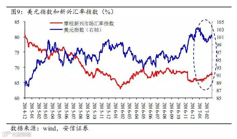 金融市场上,年初以来美股投资者情绪乐观,市场持续上涨。但美元和美债均已进入调整态势,特朗普的减税、贸易、放松金融管制等政策落实方面的不确定性,以及由此带来的加息节奏的摇摆,令这些市场参与者产生观望情绪。
