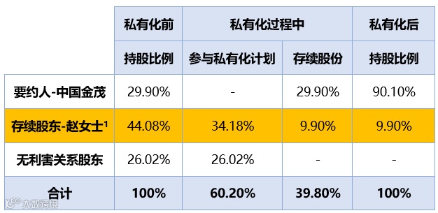在私有化计划的存续安排中,要约人中国金茂允许赵女士保留9.90%的股份,剩余34.18%股份参与私有化并收取私有化现金对价。