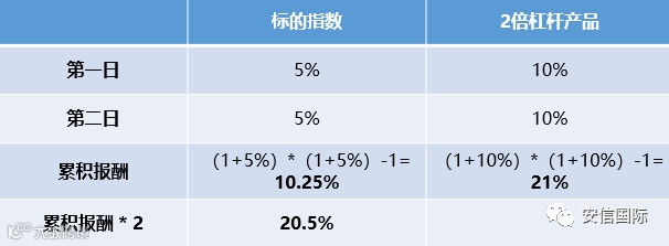 杠杆产品(Leveraged ETF)又称做多或看多ETF(Bull ETF),通过投资于股指期货、掉期合约等杠杆投资工具,实现每日追踪目标指数收益的正向一定倍数。杠杆产品通常称为“单日”产品,因为它们的投资目标是提供短期投资回报,相当于提供将相关指数放大的单日投资回报。例如投资者买入一只两倍杠杆产品,当指数于某日上升10%,有关两倍杠杆产品就应提供20%的单日回报。