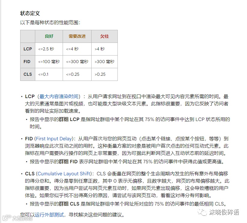 好了,今天分享的内容差不多到这里就结束了。上面介绍的PageSpeedInsights这个Google官方工具可不仅仅能查看网站速度,包括对网站如何进行修改都有。我们也可以看下这个网页核心指标到底是如何评判的,方便我们对其原理有个更深入的了解。比如优化建议也会给出。