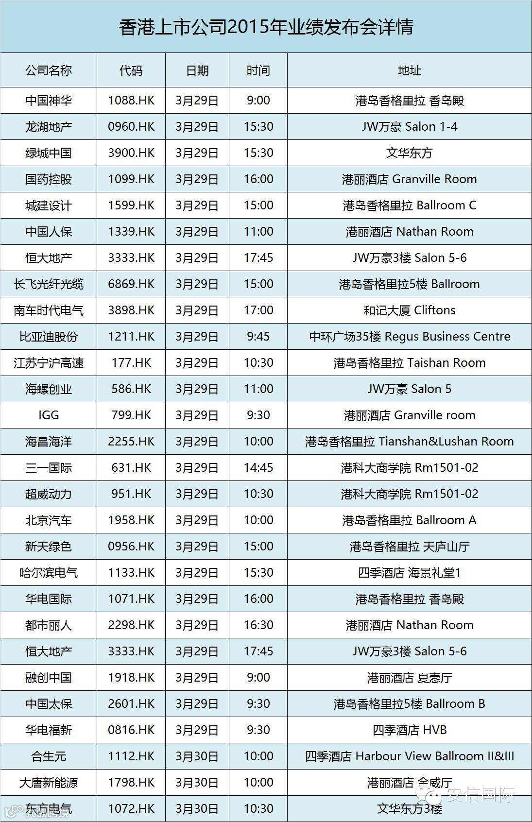 安信国际 | 港股2015业绩发布会时间表(持续更新)