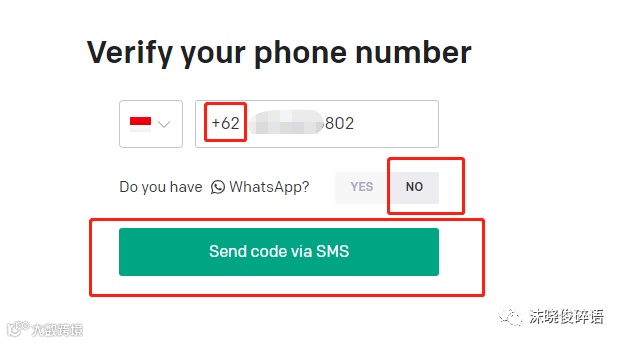 我们将刚才得到的手机号输入到刚才OpenAI注册界面需要验证手机的画面,这里有一点需要注意的是复制号码全部过来以后会带有62的区号,我们需要手动将区号取掉,因为OpenAI那边验证是有带区号的,所以在验证时需要去掉区号。我们选择No,然后选择发送短信验证码。