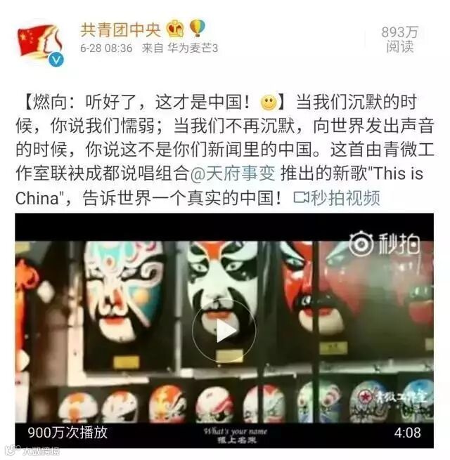 2016年6月28日,一支名为《This is China》的MV在共青团中央微信公众号头条和共青团中央微博中发布。