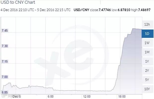 美国时间12月5日一大早,还沉浸在周一综合症里的小伙伴们,立马就被一条重磅新闻砸个了清醒:谷歌网站美元兑人民币报价惊现7.43!!外汇网站XE报价也给出了美元兑人民币日高7.43279的报价。
