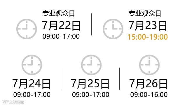 本届成果展专业观众日为7月22日(开放时间:9:00-17:00)、7月23日(开放时间:15:00-19:00),7月24日-26日为公众开放日 。