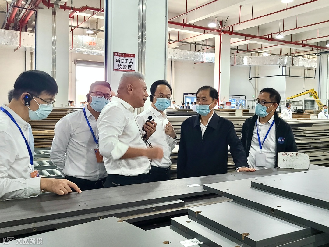 省工信厅厅长翁玉耀深入金牌厨柜数字化工厂现场调研(右二)