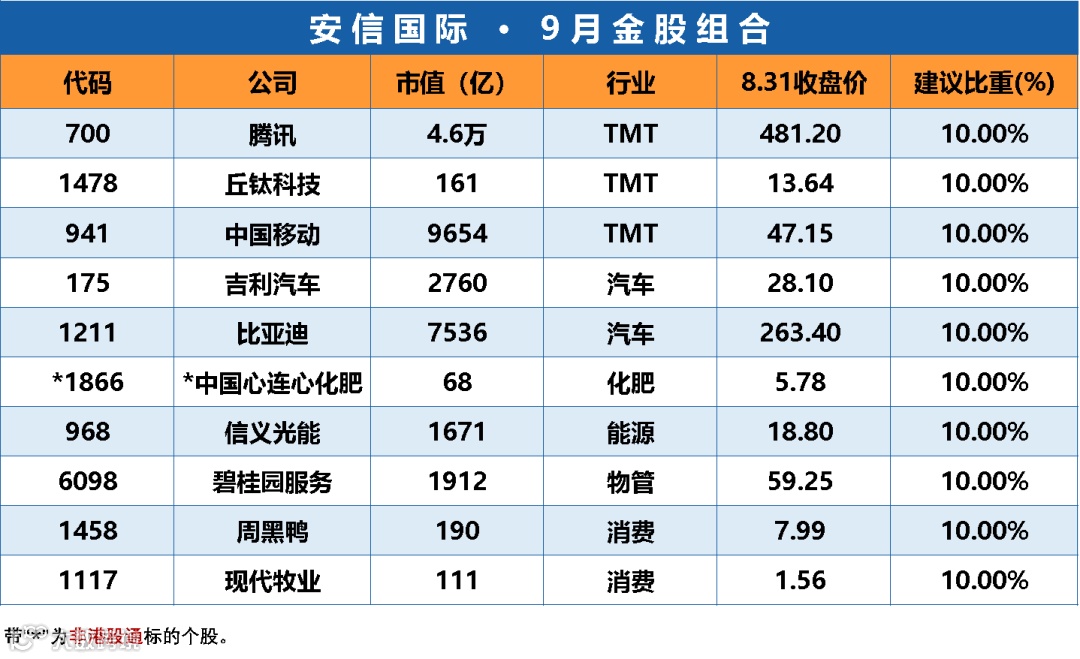 8月底我们如期举办了9月金股组合会议,并给予了配置比例建议,组合如下,详情可参考安信国际公众号文章:《慧眼识金股-2021年9月组合》
