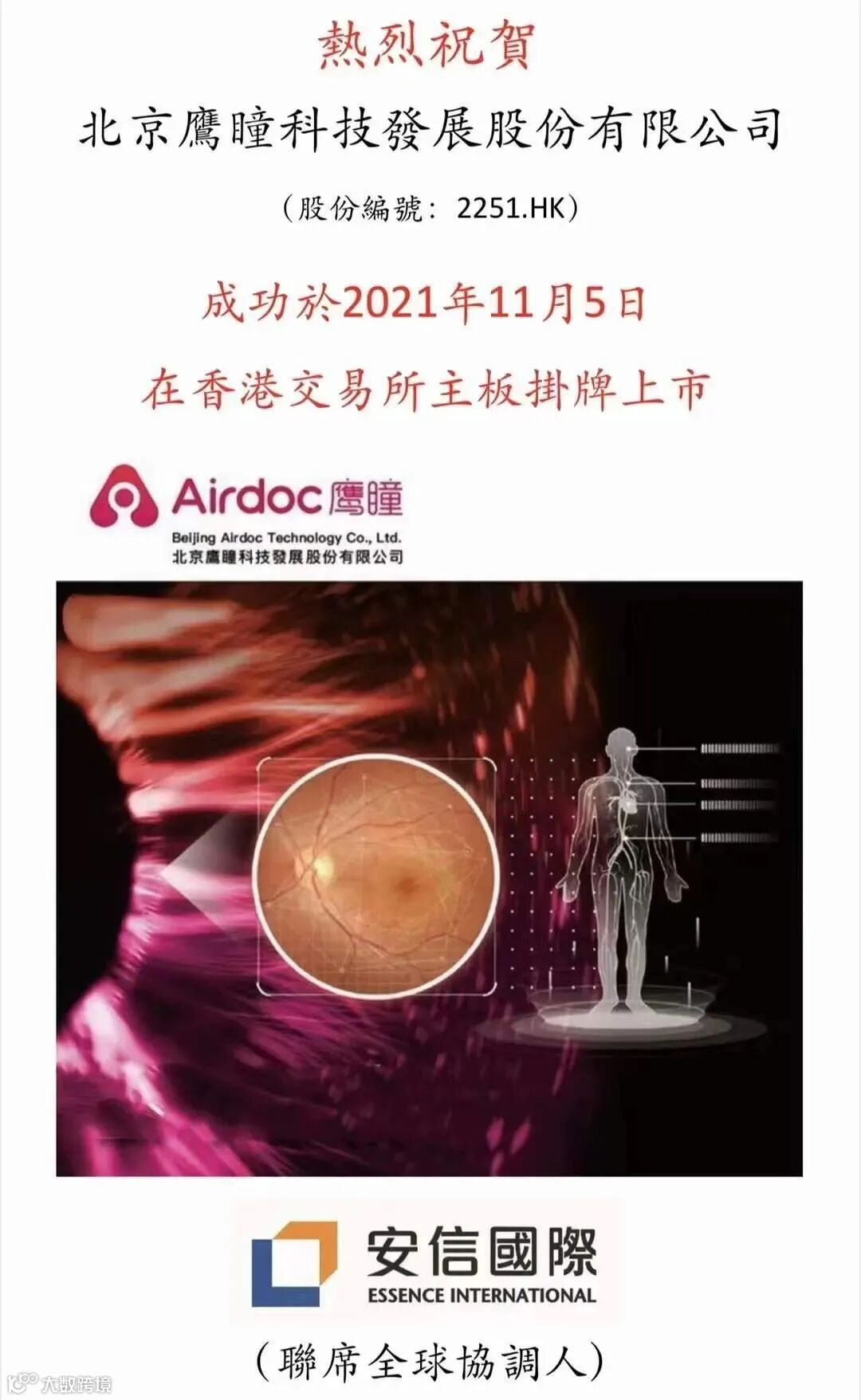 2021年11月5日,北京鹰瞳科技发展股份有限公司(以下简称“鹰瞳科技”或“公司”,股票代码:2251.HK)成功于香港联交所挂牌上市。安信国际(证监会中央编号:AVL376)担任此次鹰瞳科技在香港首次公开发行的联席全球协调人,助力鹰瞳科技在香港联交所主板挂牌上市。