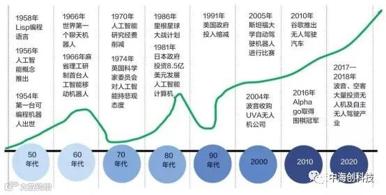 在20世纪50年代早期,美国巴雷特电子公司(Barrett )开发出世界上第一个自动导引车系统,之后自主无人系统技术与人工智能技术的结合开始逐渐发展,并获得投资,但其中也遭遇几次低谷。直到2000年之后,人工智能进入稳定发展期,自主无人系统的投资逐渐加大。2017-2018年,自主无人系统进入投资爆发期。