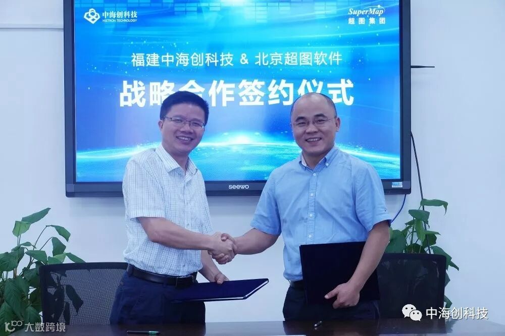 2019年8月8日,超图集团高级副总裁、平台群总裁白杨建带领超图集团生态伙伴部总监丁强及超图软件浙闽平台客户中心总经理庄千夏等到访中海研究院参观展开座谈,并与中海创科技集团签署战略合作协议。中海创科技集团副总裁林泽生、中海创科技集团产品与解决方案部总监王欢、中海创科技集团物联网事业部总监冯圣龙及中海创科技集团产品与解决方案部副总监郭文芳等陪同参观。