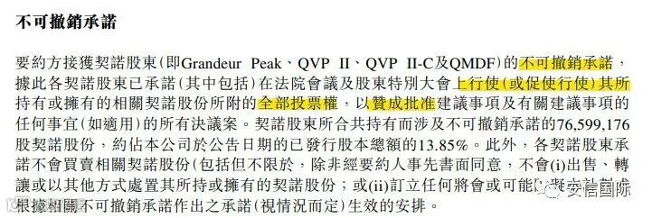 指一名股东给予要约人一项不可撤回的承诺,表示接纳该要约人的要约或在协议安排中在相关决议上投赞成票注。同时,作出不可撤销承诺的股东不会被视为要约人的一致行动人,也就是相当于提前锁定了在独立股份中需接纳的要约股份或赞成票。