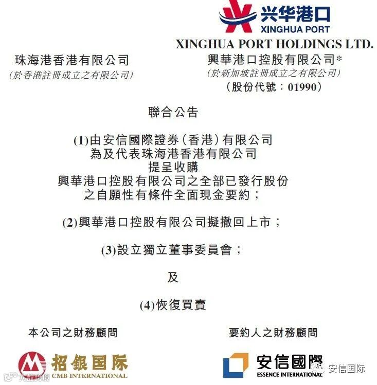 以近期成功私有化的的兴华港口(1990.HK)为例,要约人采用自愿要约方式。要约人作为第三方不持有目标公司任何股份,若没有股东作出不可撤销承诺的支持,将面临极高的收购门槛和资金需求。
