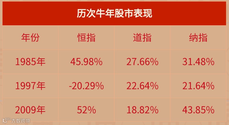 由上图可见,历年的牛年股市,美股都有非常不错的表现,而港股涨跌较为分化,需关注其中的风险。