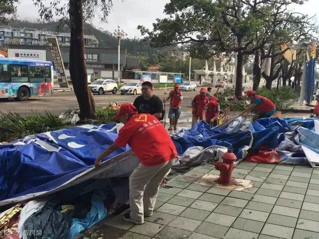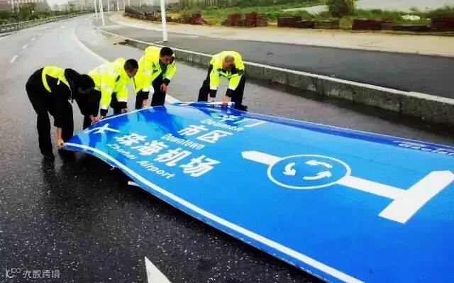 处理广告牌看似简单,其实暗藏风险很大,分分钟被吹跑。在台风登陆最强劲的时刻,你能看到民警们是三个人手牵着手一起,如果独自要走,就手里拿一个大沙包,这样可以避免被风吹走。