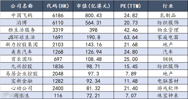 1)大消费:中国飞鹤(6186.HK)国内本地奶粉龙头之一、滔搏(6110.HK)国内最大运动用品零售商及百丽子公司。