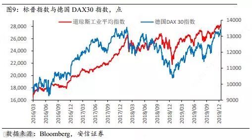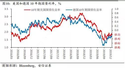 随着中美达成第一阶段贸易协议、美国和欧洲经济出现企稳,欧美权益市场持续上行,美国标普500指数不断突破新高,德国DAX30指数也已经达到2018年初以来的最高点;美国和德国10年期国债收益率也都出现持续回升。