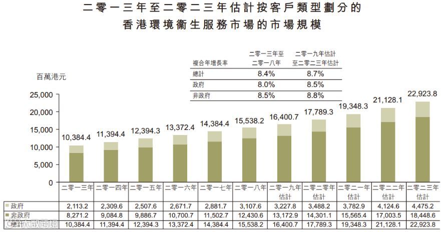 香港环境卫生服务的主要客户包括政府及非政府客户。非政府部门占香港环境卫生服务市场中的最大部分。香港非政府部门市场规模由2013年的82.7亿港元增加至2018年的124.3亿港元,复合年增长率约8.5%,并预期自2019年至2023年按约8.8%的复合年增长率增长,于2023年达到184.9亿港元。政府部门录得约8.0%的复合年增长率,由2013年的21.13亿港元增至2018年的31.1亿港元,并预期自2019年至2023年按8.5%的复合年增长率将达44.75亿港元。